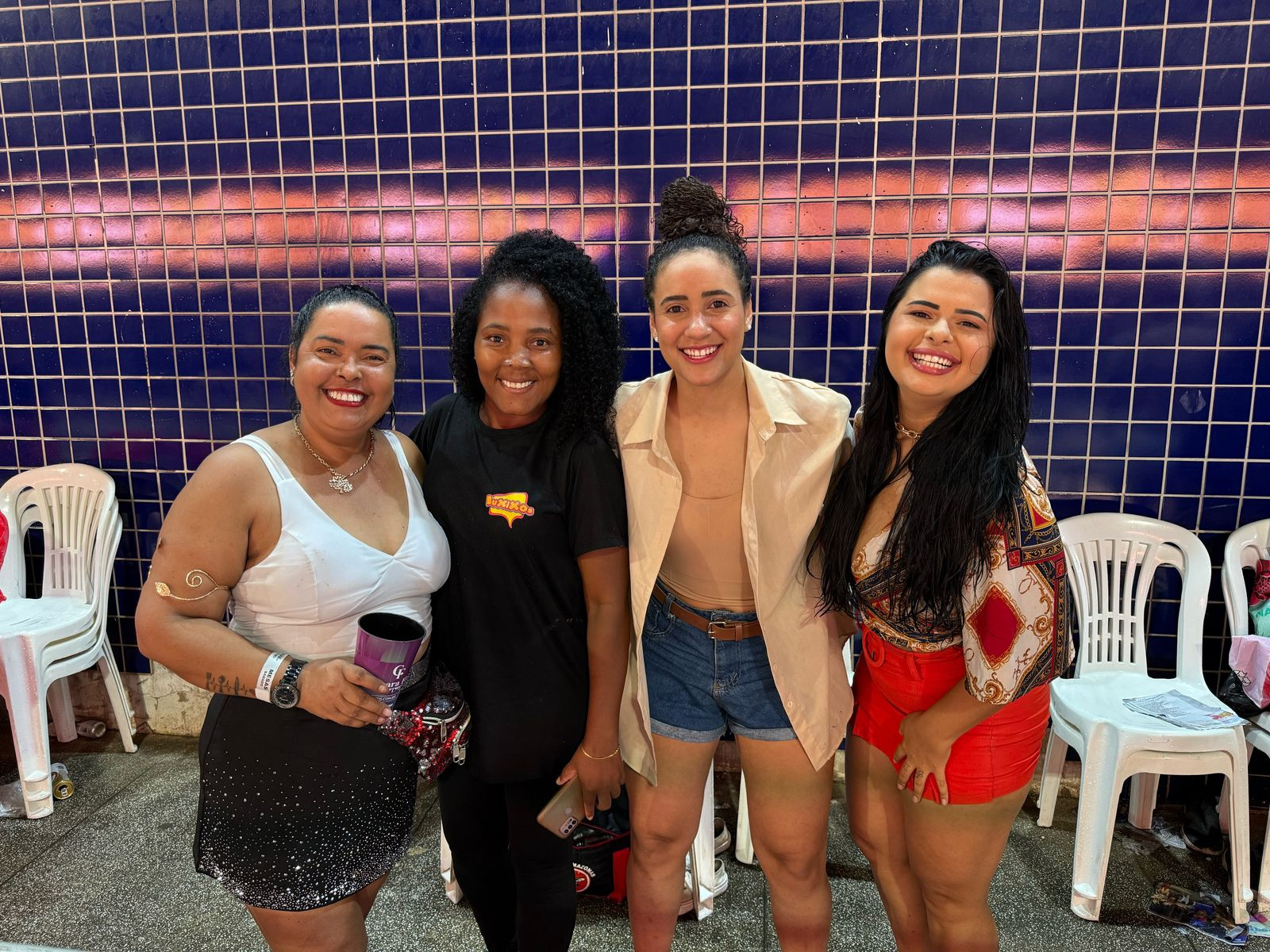 As amigas Priscila Figueredo e Jeneffer Santos e a mãe e filha Iris Regina e Maria Braum estavam entusiasmadas com o que viam na avenida. Iris se disse maravilhada pela qualidade do que era apresentado.
