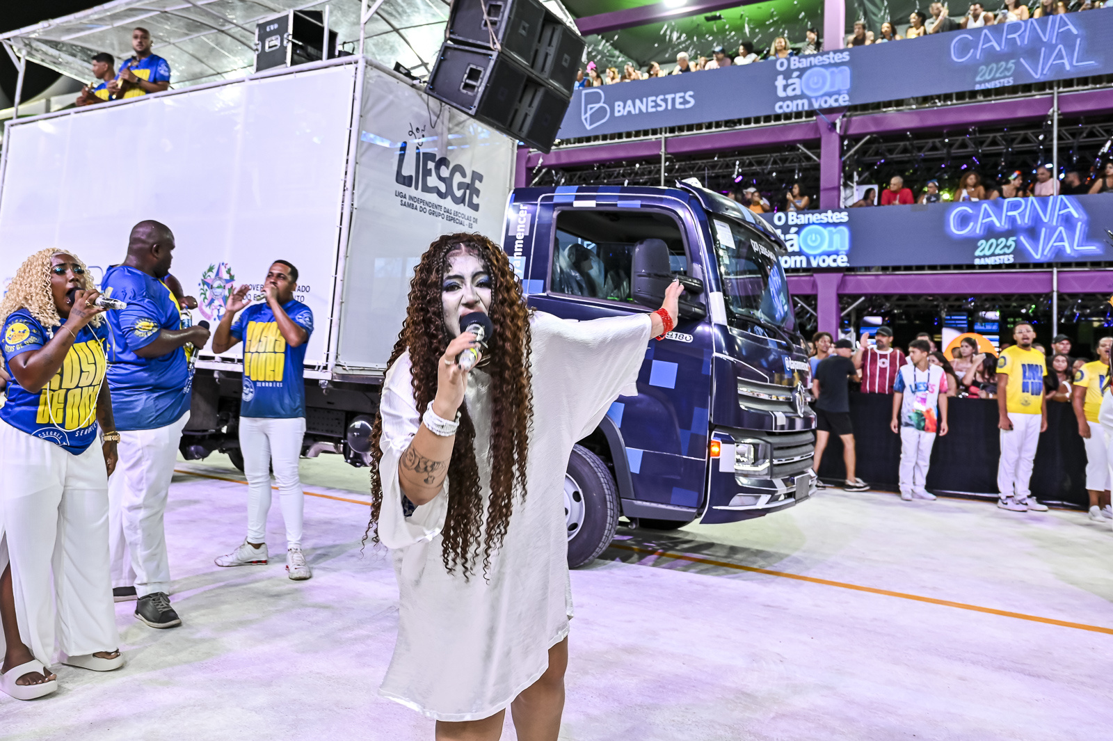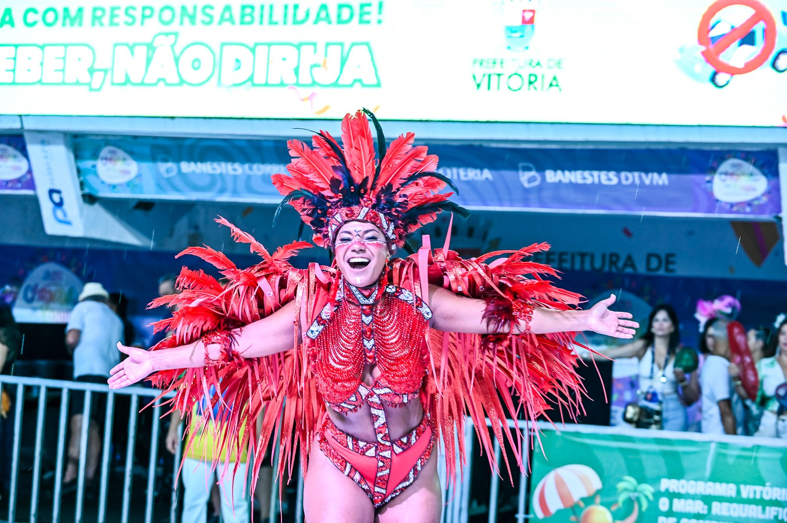 A voz potente de Letícia Jesus, a única mulher à frente de um microfone oficial no Carnaval de Vitória, foi um dos pontos altos do desfile. Com mais de 20 anos de história na escola, Letícia conduziu o samba com paixão e segurança. Em diversos momentos, o público se uniu em coro para cantar o refrão do samba-enredo: