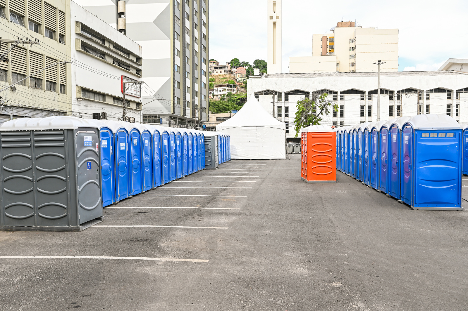 Centenas de banheiros químicos, posicionados em pontos estratégicos