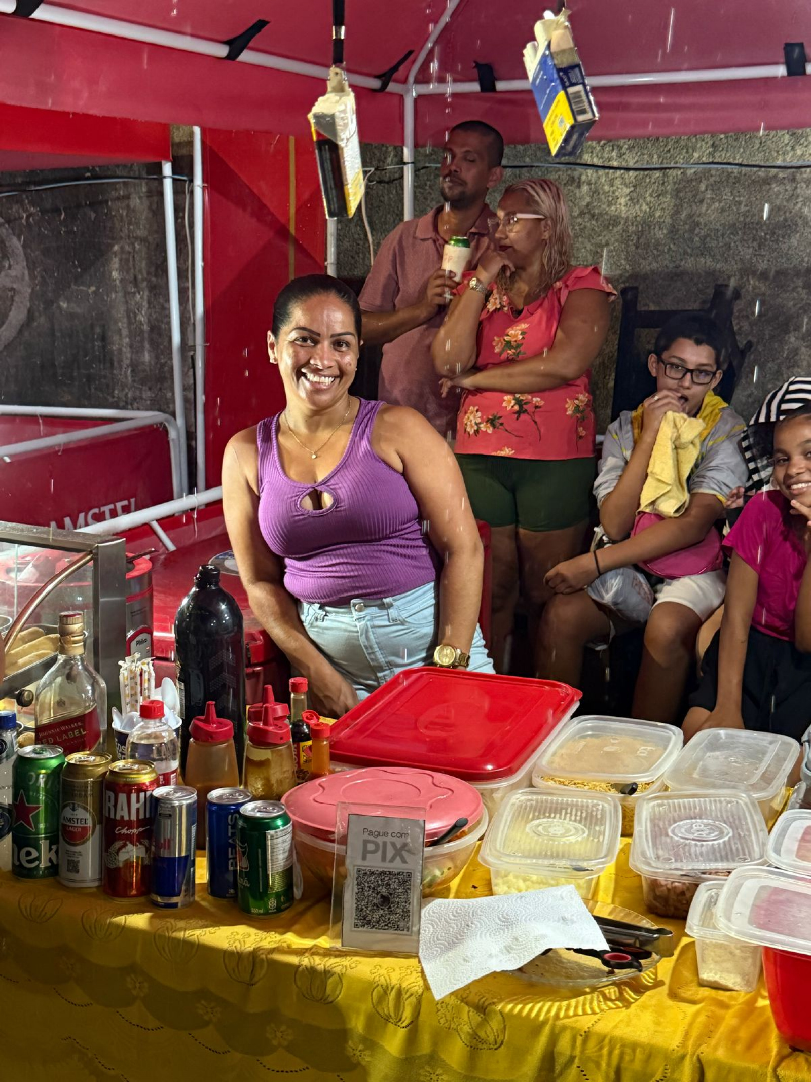 Rafaele Oliveira, que vende salgados, pão com carne, espetinhos e bebidas no local, fala sobre o movimento: "É uma grande oportunidade para nós, ambulantes. O movimento está intenso, e com a venda dos nossos produtos, está todo mundo animado! Estamos bombando! A gente aproveita esse período para garantir a renda extra, e no Sambão é onde o negócio pega fogo!"