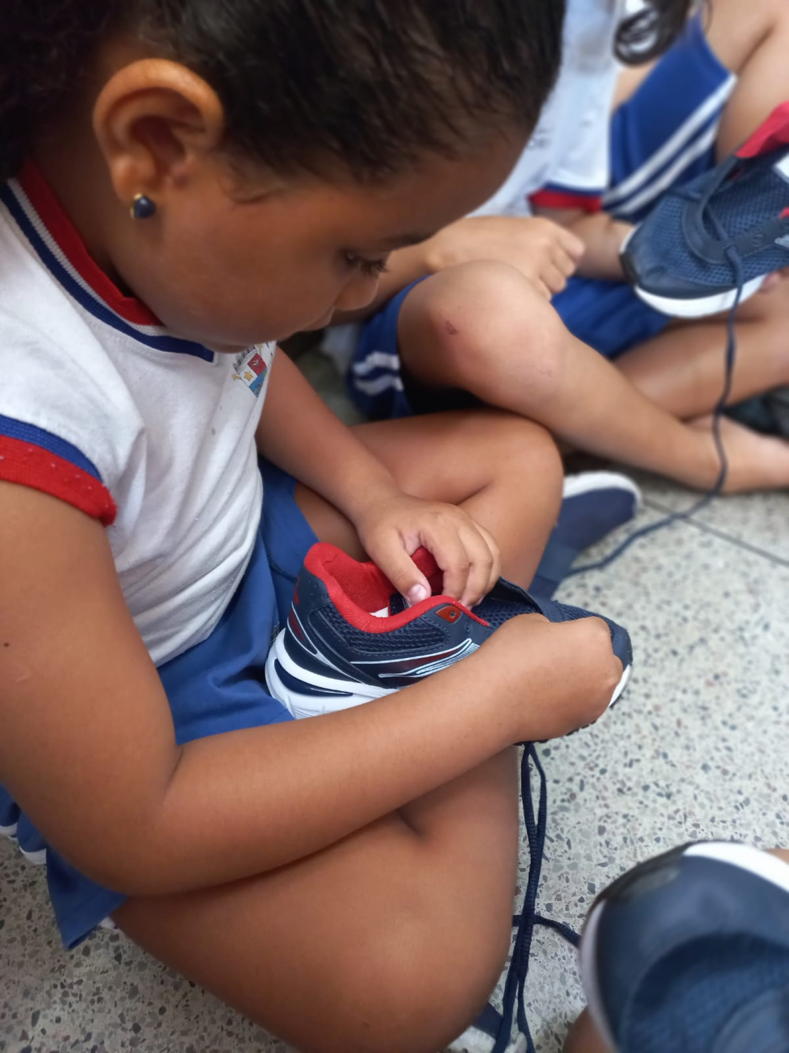 Durante a atividade, as crianças participaram de diversas tentativas de acertos e erros, aprendendo a colocar os cadarços corretamente, escolher o tamanho adequado e identificar seus tênis, escrevendo seus nomes em cada par. A professora Gina orientou os alunos sobre como calçar e amarrar os tênis, e incentivou a colaboração entre eles para ajudar aqueles que ainda estavam com dificuldade.