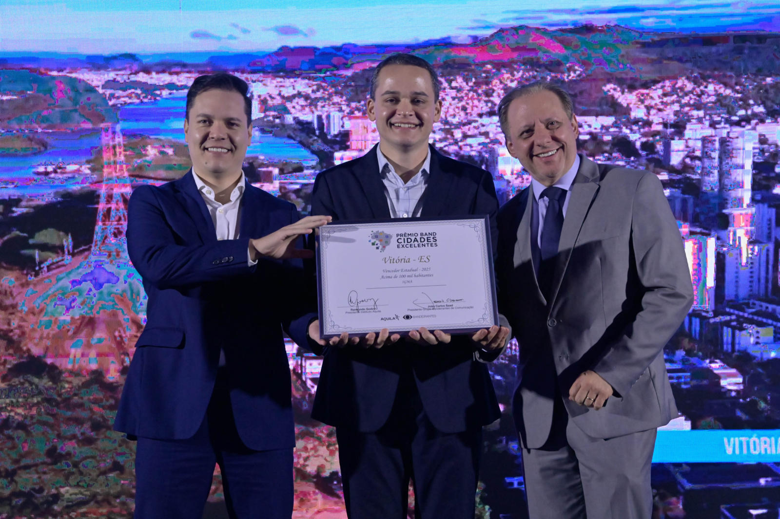 Vitória é a grande vencedora do Prêmio Band Cidades Excelentes 2025. Em reconhecimento às entregas para a qualidade de vida dos moradores e à excelência em seus serviços, a capital foi a campeã estadual do IGMA/Cidade Excelente, nesta quarta-feira (26), em evento realizado no auditório do Tribunal de Contas do Espírito Santo.