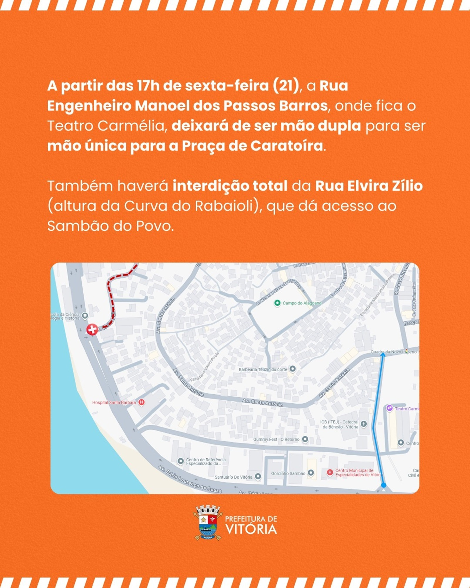 A partir das 17h de sexta-feira (21), a Rua Engenheiro Manoel dos Passos Barros, em Mário Cypreste, onde fica o Teatro Carmélia, deixará de ser mão dupla para ser mão única para a Praça de Caratoíra.