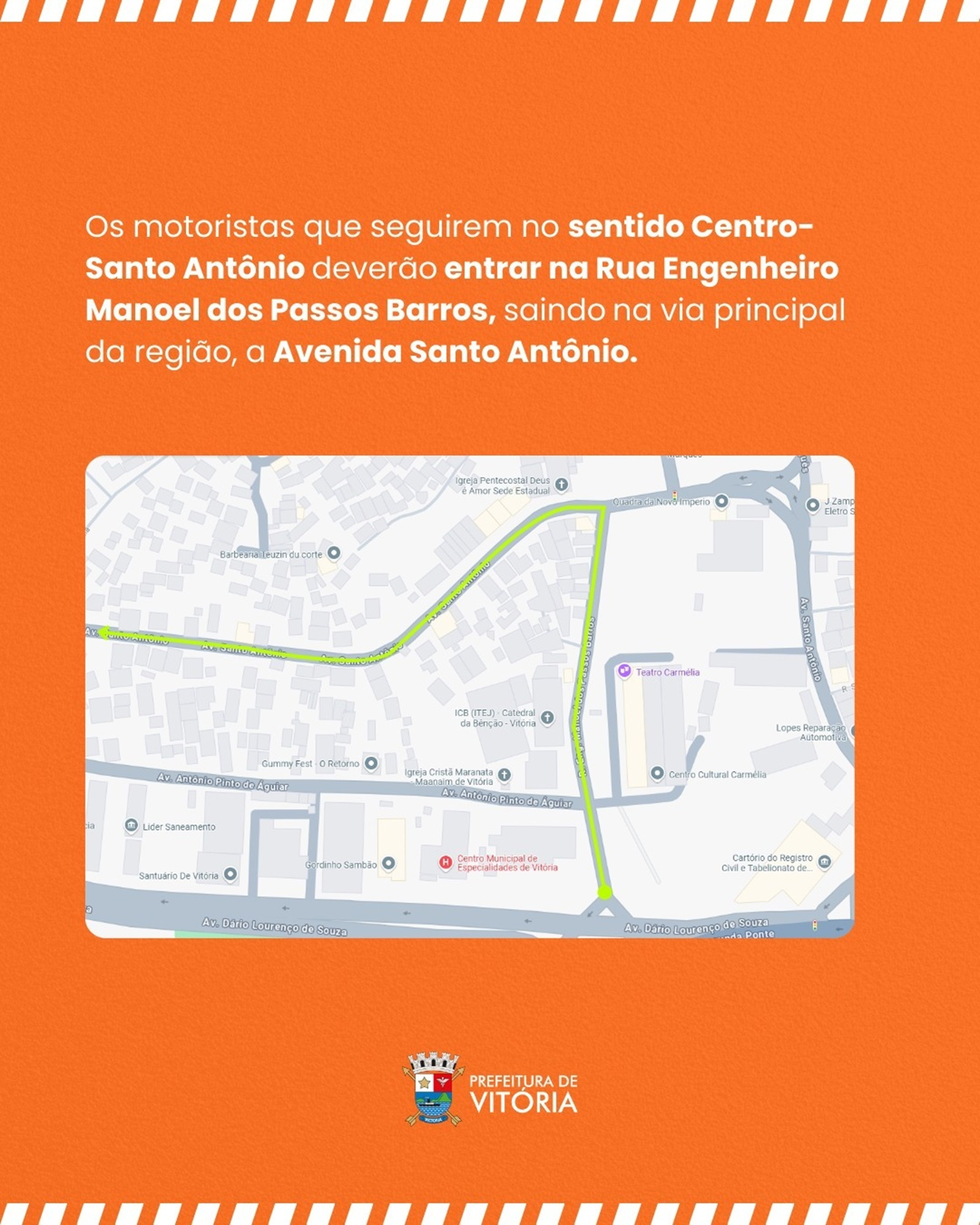 Os motoristas que seguirem no sentido Centro - Santo Antônio encontrarão o bloqueio em frente ao Teatro Carmélia. Os veículos deverão entrar na Rua Engenheiro Manoel dos Passos Barros, saindo na via principal da região, a Avenida Santo Antônio.