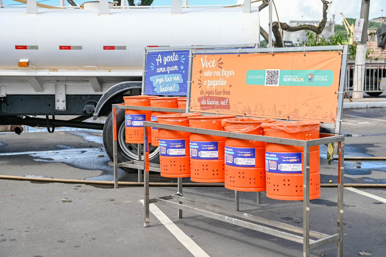 Papeleiras instaladas na avenida Beira Mar no carnaval de rua.