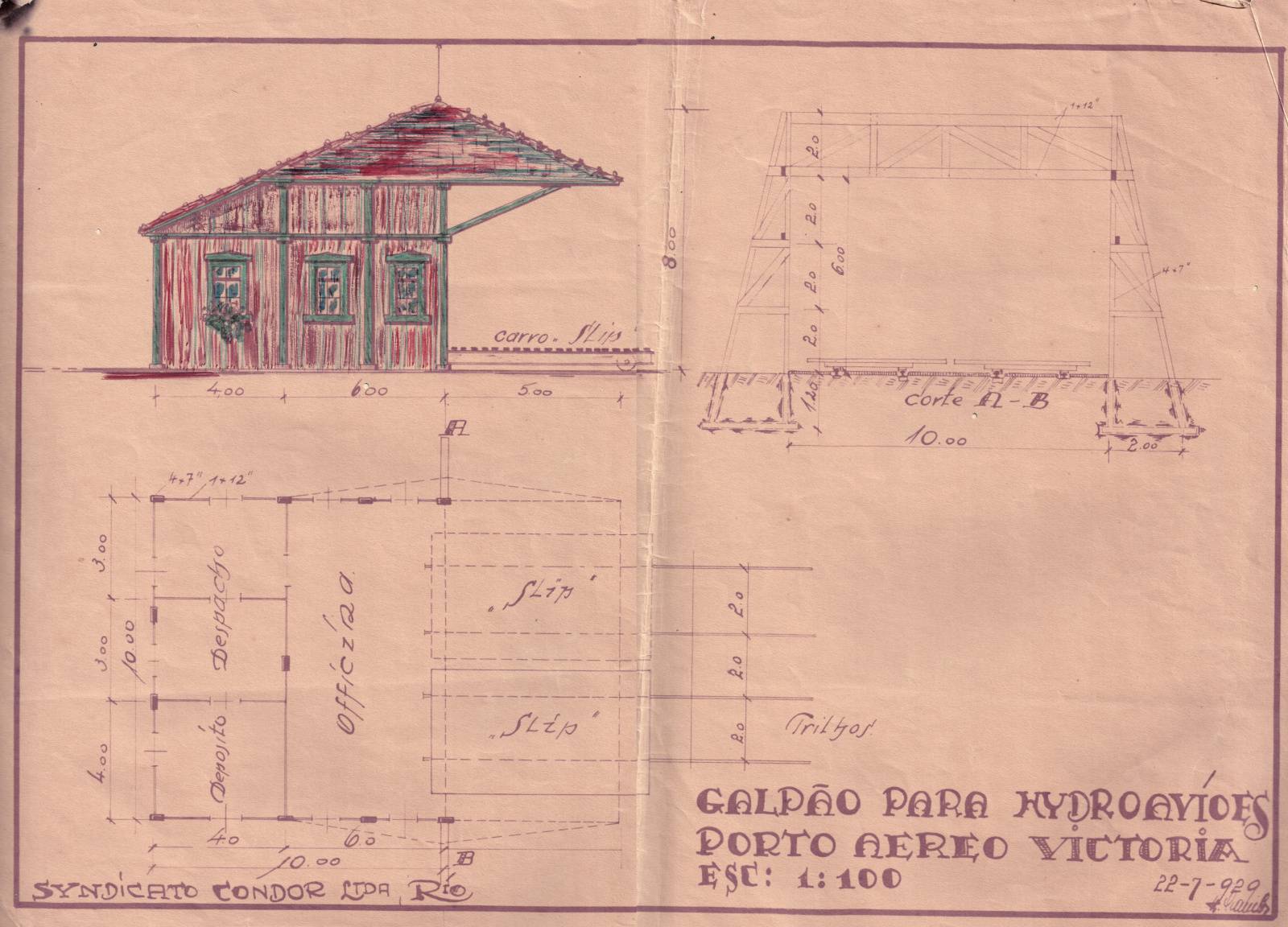 "Para o encalhamento dos aviões, são necessários dois carros "Slip", os quaes são puxados para o interior do galpão por meio de um guincho. Em construção anexa a esse galpão, encontra-se a officina com guindaste para troca de motores, deposito, sala de despachos etc. A gazolina será depositada em tanque subterraneo. O terreno em questão foi aterrado com 3 metros e cercado com um muro de madeira."