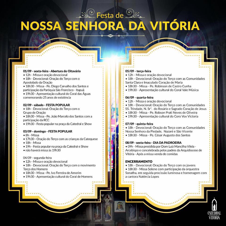 Festa de Nossa Senhora da Vitória começa nesta sexta na Catedral de Vitória