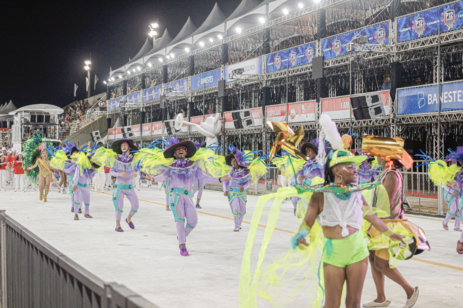 Os componentes da escola roxa e amarela apresentaram a favela como um lugar de festas em bonitas fantasias. Um mundo colorido e alegre com comemorações de santos tradicionais. Eventos diversos que ali têm destaque. São batizados, casamentos, aniversários com a participação das mais diversas pessoas também de fora dali que unidas celebram a vida nas favelas.