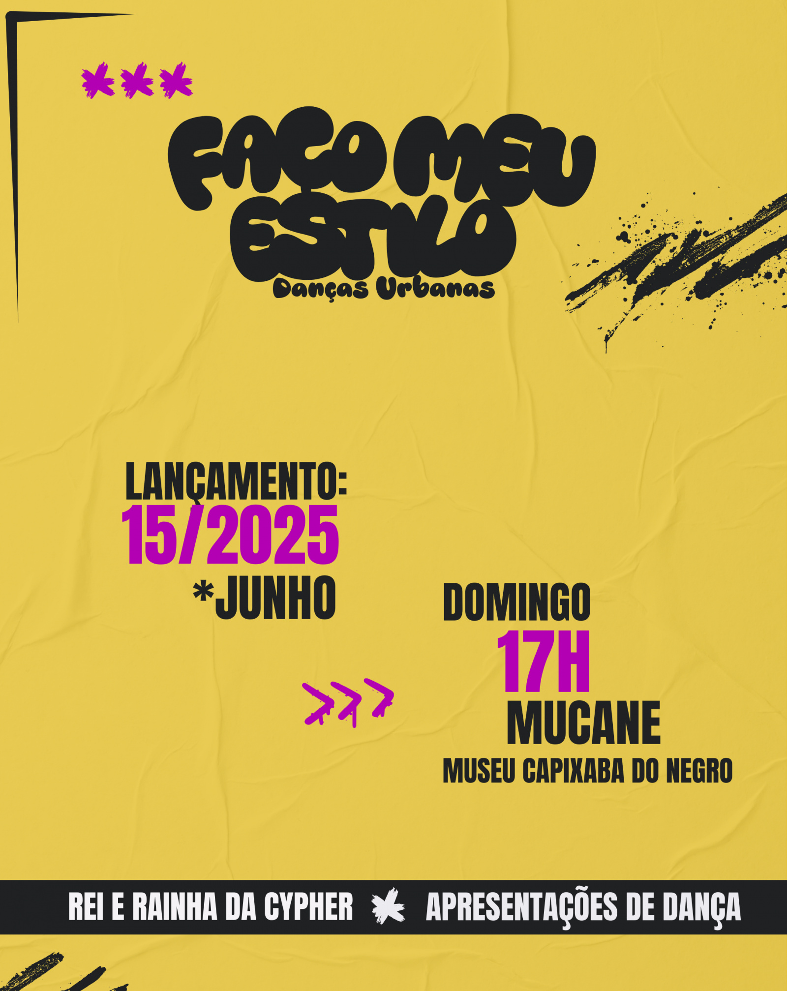 Serviço Lançamento do projeto "Faço Meu Estilo: Danças Urbanas" Quando: domingo (15) às 17 horas Onde: Museu Capixaba do Negro "Verônica da Pas" (Mucane) - Avenida República, 121 - Centro Histórico de Vitória. Informações: (27) 98182-3797 Entrada gratuita. Classificação indicativa: livre.