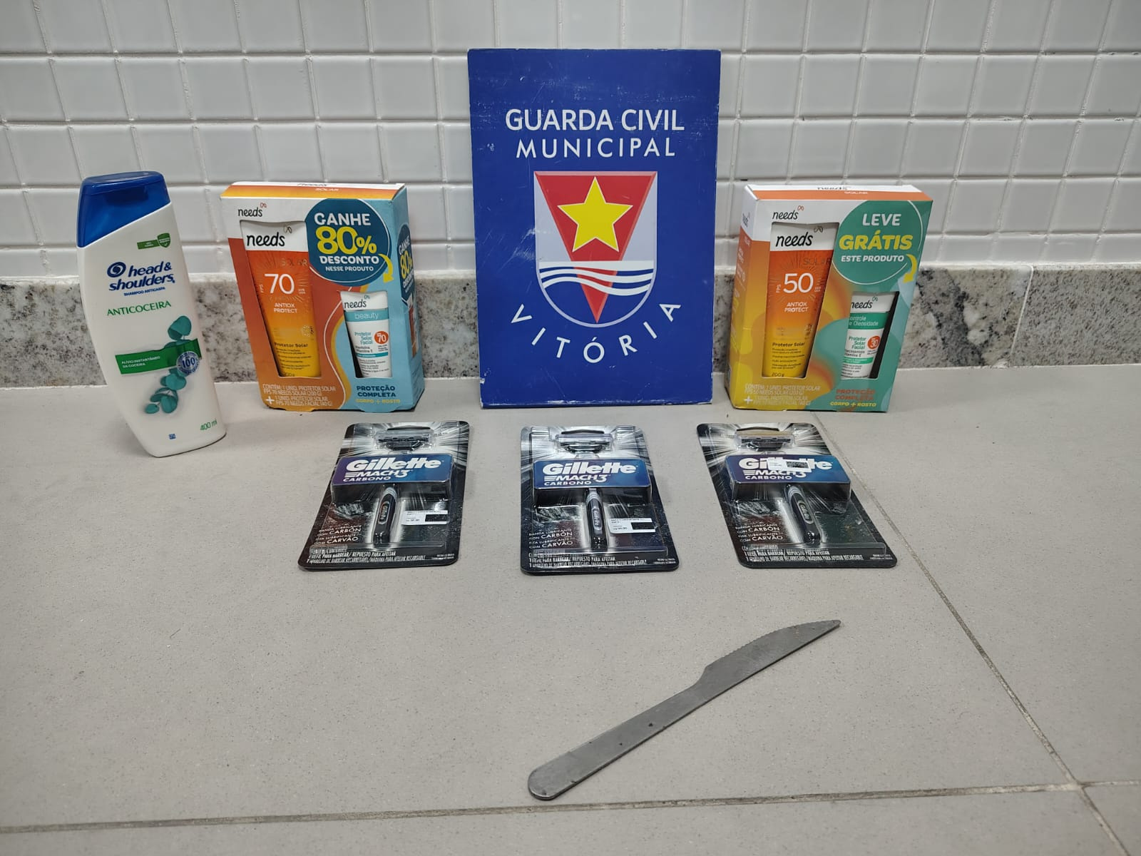Durante a busca pessoal, foi verificado que o indivíduo carregava uma bolsa, na qual foram encontrados dois itens de protetor solar, três aparelhos de barbear descartáveis, um shampoo e uma faca.