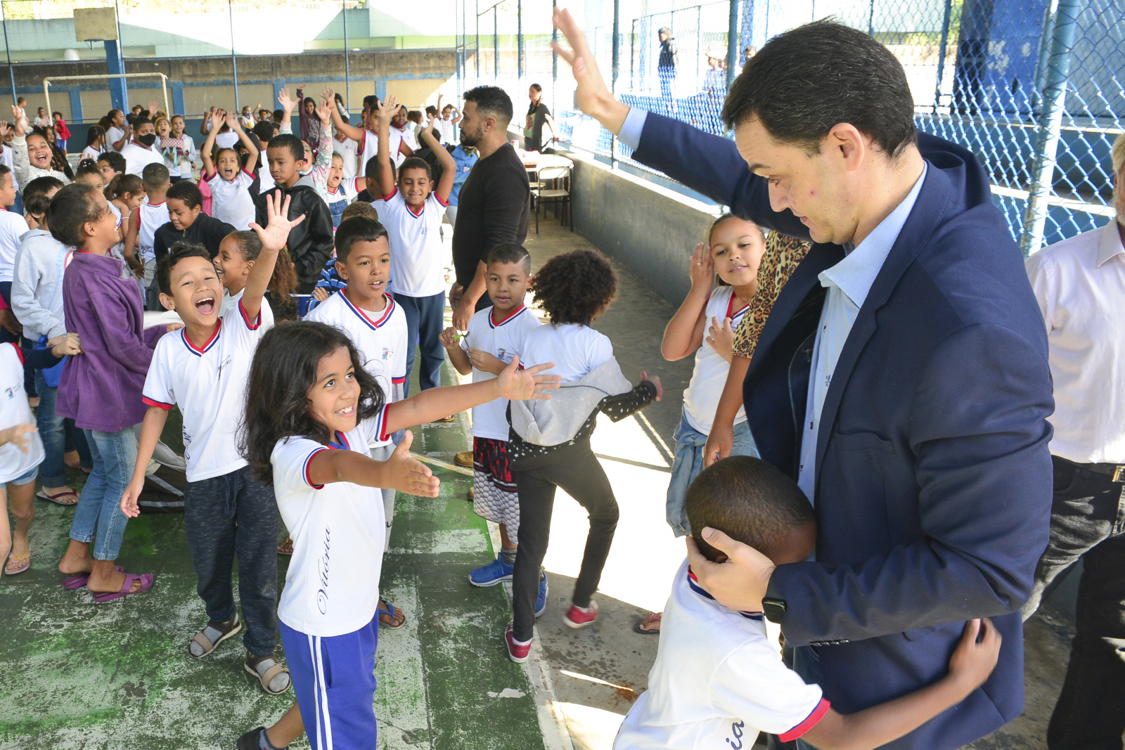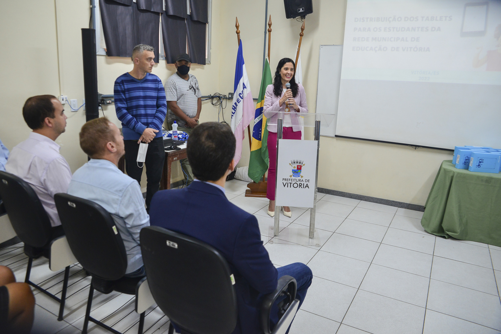 "Hoje estamos aqui reduzindo a desigualdade. Nossos estudantes terão internet dentro de casa, com acesso à plataforma AprendeVix. No sábado, estivemos na Grande São Pedro para dar ordem de serviço para a construção da nova sede do último Cmei de madeira de Vitória, que será um Cmei modelo, o Geisla da Cruz Militão. É essa página que viramos em Vitória, tiramos o dinheiro de privilégios para poucos e distribuímos para a cidade. A partir de agora, o seu filho vai estar em casa, acessando a plataforma AprendeVix e fazendo atividades, dever de casa, aprendendo. Agora temos um instrumento de comunicação online para os estudantes de Vitória", destacou o prefeito Pazolini.