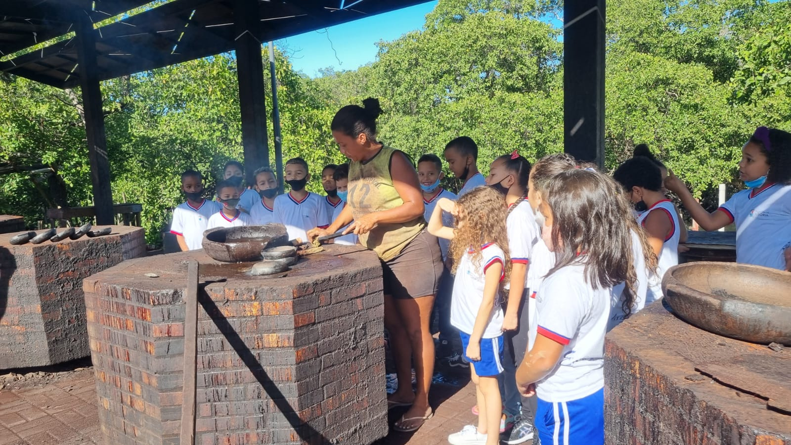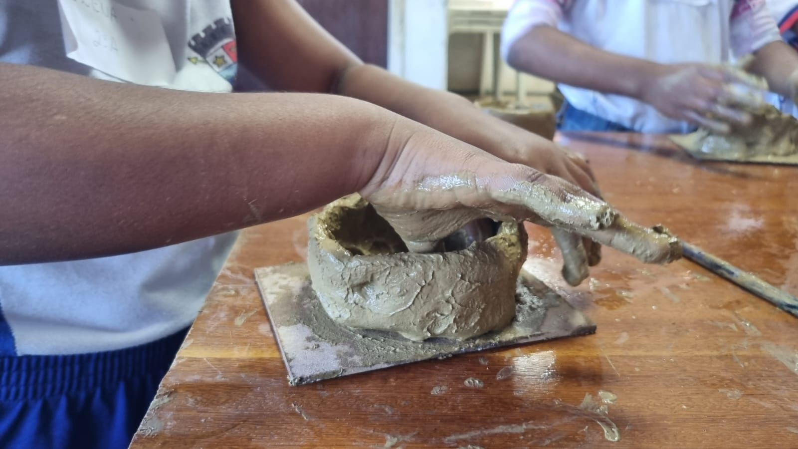 Além de conhecer o passo a passo da produção das panelas de barro, desde a modelagem até a queima para a posterior pintura das peças com o tanino extraído do mangue, os estudantes produziram uma panelinha com orientações da artesã Jucileia Barbosa. As panelinhas vão secar, passar pela queima e receber a tinta para depois serem entregues na unidade de ensino.