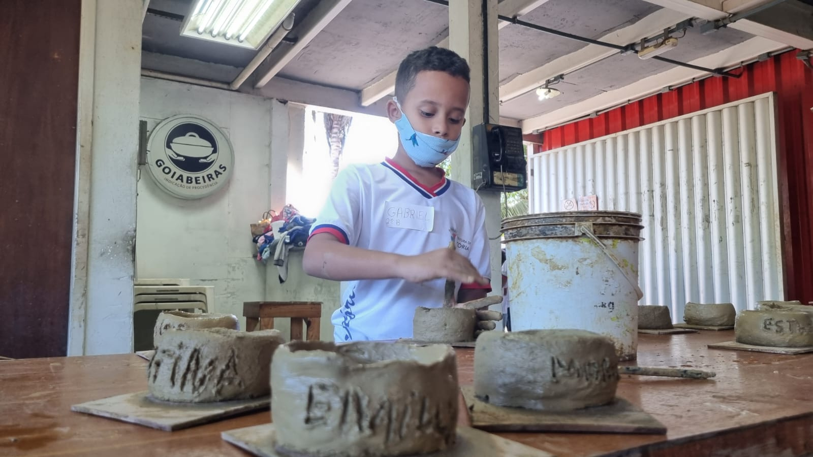 "Eu aprendi que nunca pode jogar lixo no mangue, que os caranguejos moram lá e não pode pegar ele pequeno, se não fica sem. Eu gostei de vir aqui, ver as panelas. Achei legal mexer com a argila, é meio grudado, parece um chocolate derretido. Escrevi meu nome e agora vai queimar e depois vai pra escola", contou o estudante Miguel Azevedo, de 7 anos.