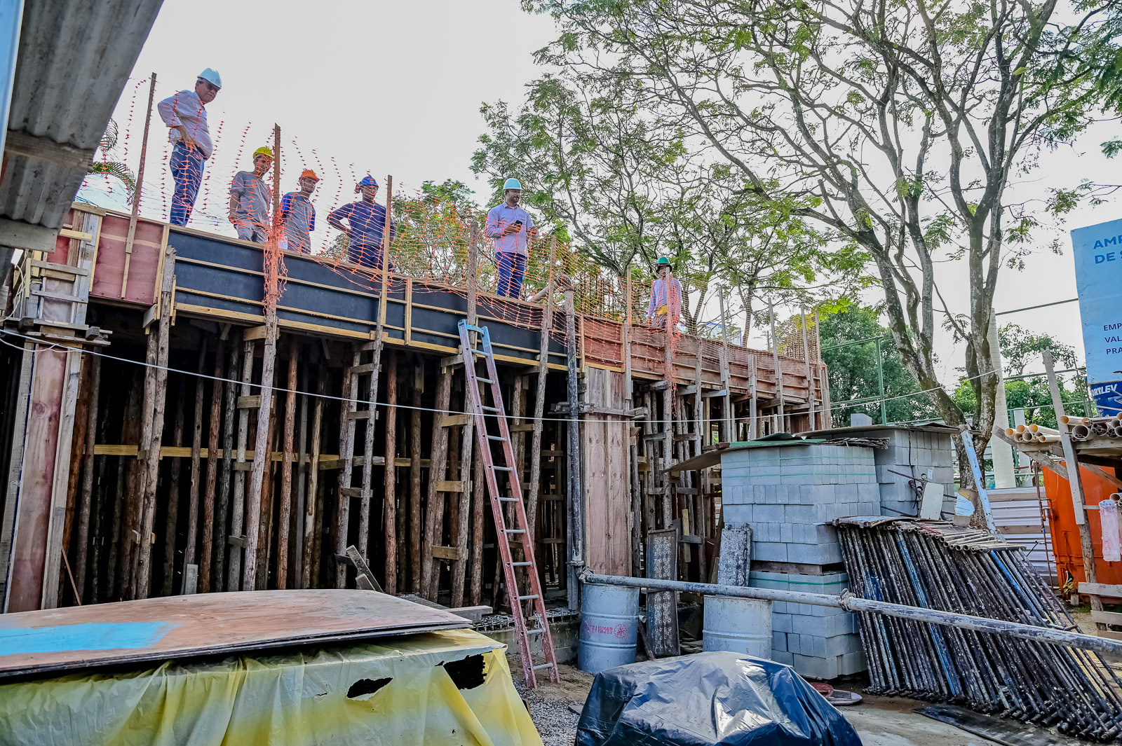 O prefeito Lorenzo Pazolini visitou as obras de concretagem da laje junto aos os vereadores Bruno Malias e Maurício Leite, além do secretário de Obras da capital, Gustavo Perin, e da diretora da UBS, Vivian Kecy.
