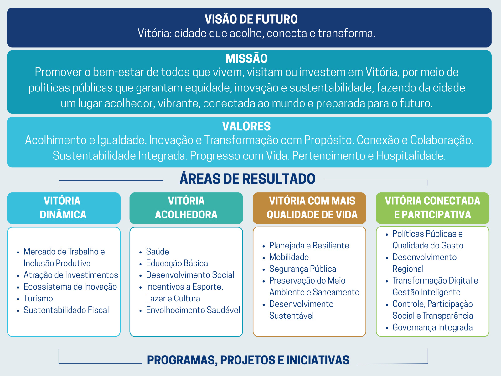 - Vitória Conectada e Participativa: políticas públicas efetivas e qualidade do gasto, desenvolvimento regional, transformação digital e gestão inteligente, controle, participação social e transparência, governança integrada.